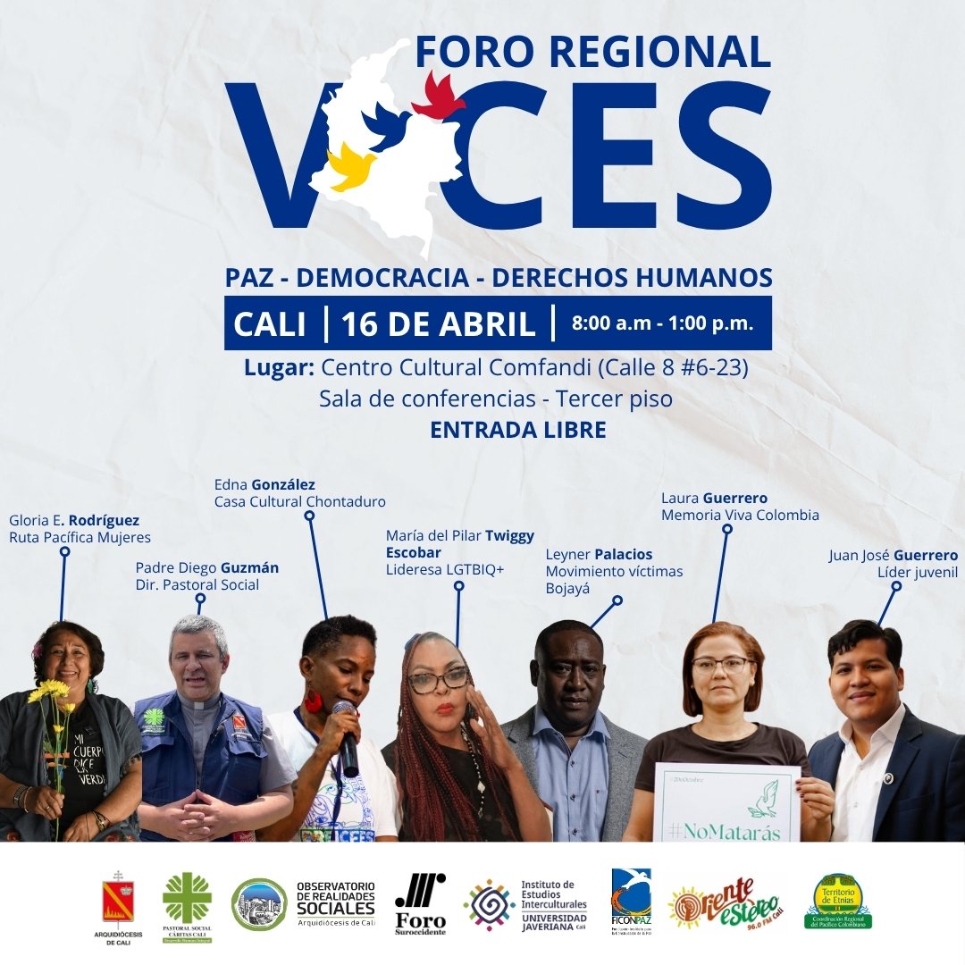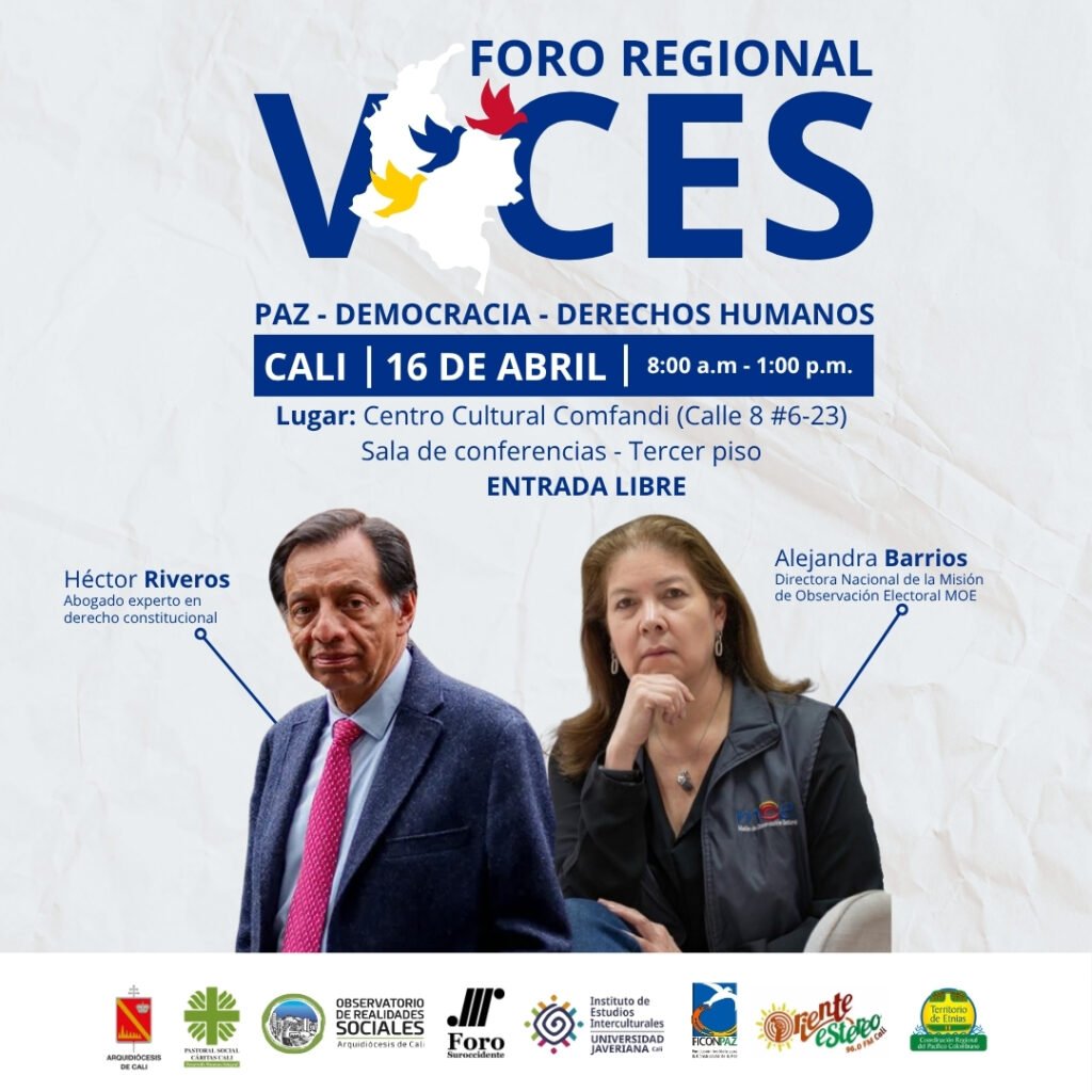 El encuentro, convocado por el Observatorio de Realidades Sociales de la Arquidiócesis de Cali, Foro Nacional por Colombia – Capítulo Suroccidente, la Fundación Instituto para la Construcción de la Paz (FICONPAZ), el Instituto de Estudios Interculturales, Oriente Estéreo y la Coordinación Regional del Pacífico Colombiano, busca ir más allá de un análisis coyuntural. Su propósito es generar un diálogo amplio que permita comprender los retos estructurales que enfrenta el país en materia de participación, garantía de derechos y construcción de paz.